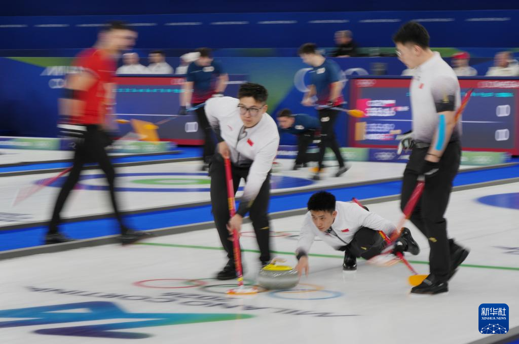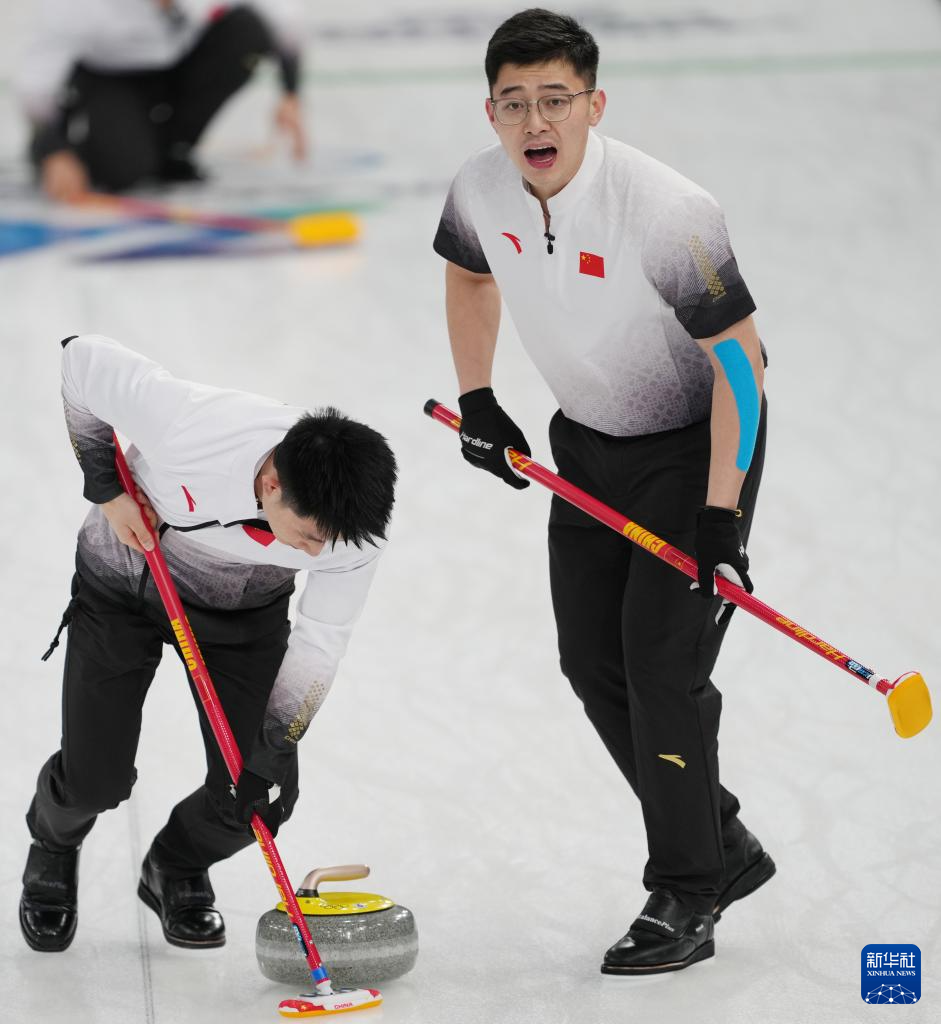 2月13日,中国队选手费学清(中)在比赛中掷壶。