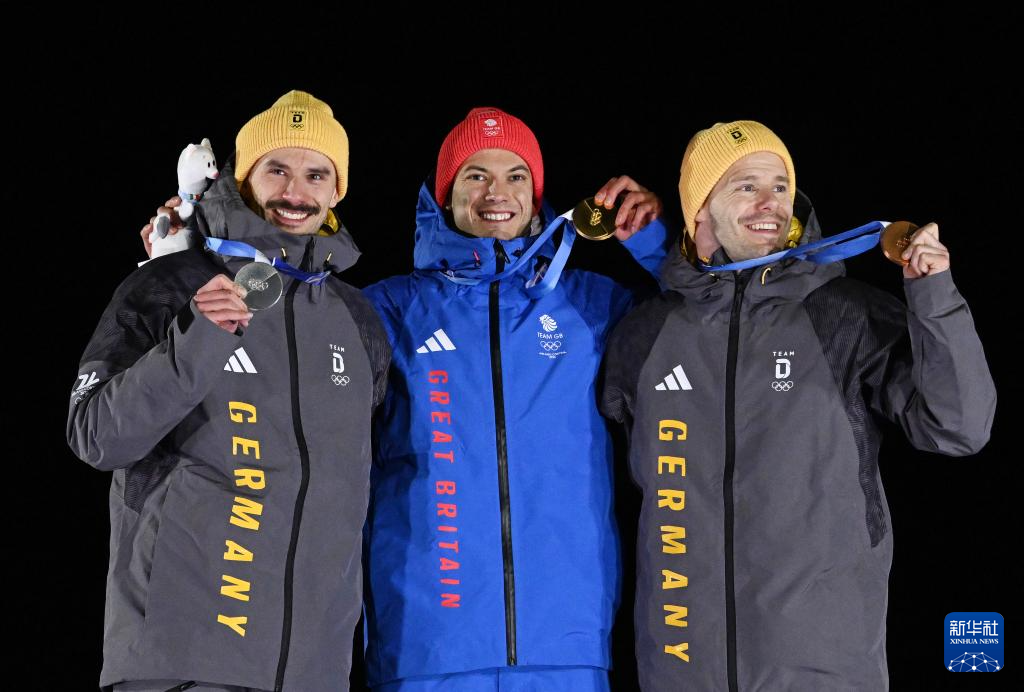 2月13日,冠军英国选手韦斯顿(中)、亚军德国选手容克(左)和季军德国选手格罗特赫尔在颁奖仪式上合影。