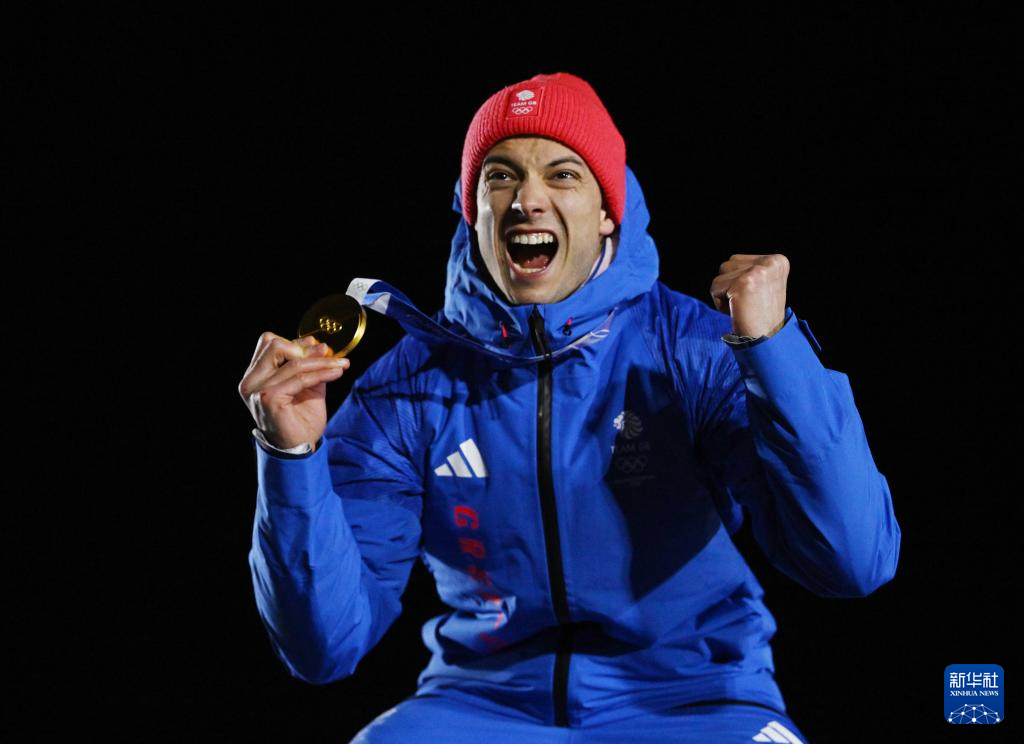 2月13日,冠军英国选手韦斯顿在颁奖仪式上庆祝。