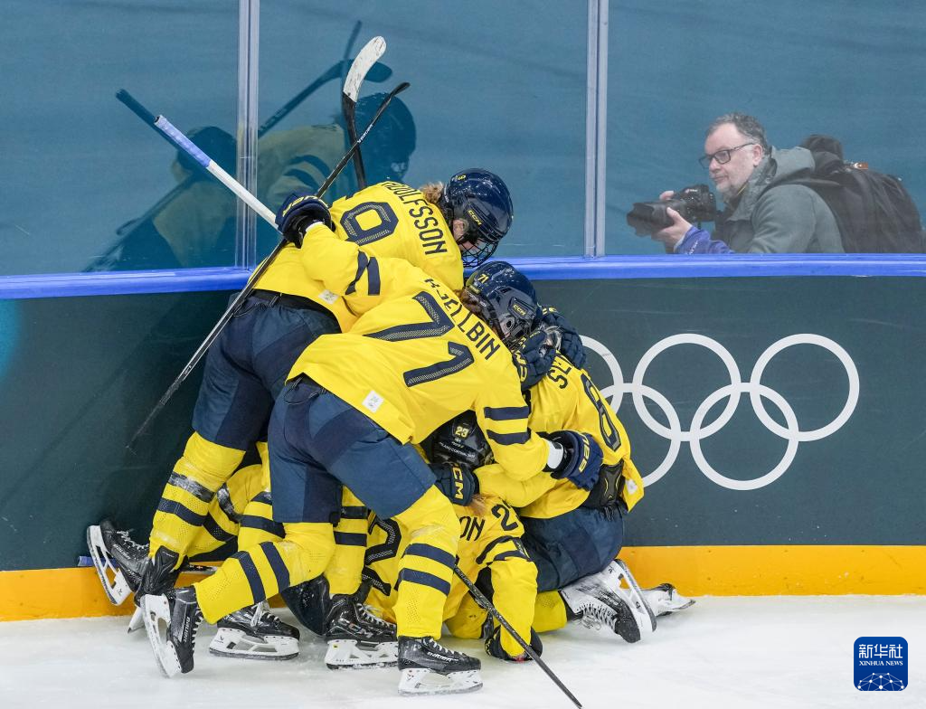 2月13日,瑞典队球员在比赛中庆祝进球。
