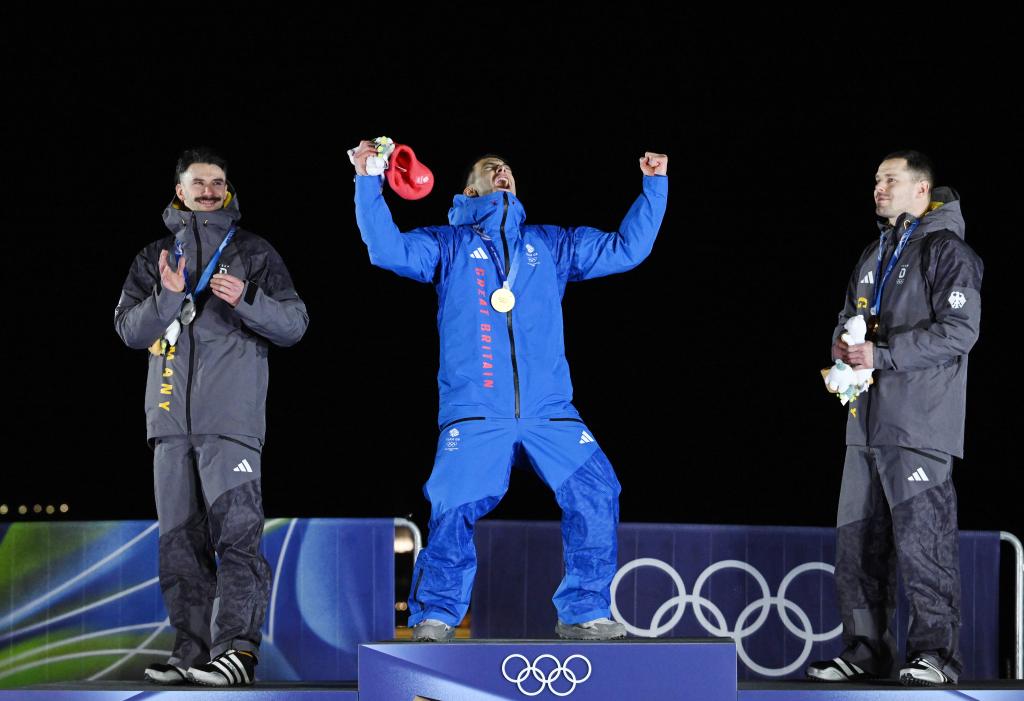 2月13日,冠军英国选手韦斯顿(中)、亚军德国选手容克(左)和季军德国选手格罗特赫尔在颁奖仪式上。新华社记者 连漪 摄