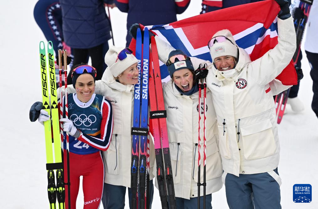 2月14日,挪威队选手海迪·文格(右二)在冲线后与队友庆祝。挪威队获得冠军。