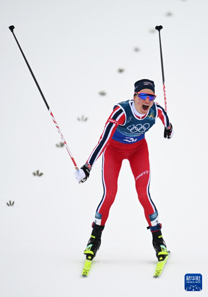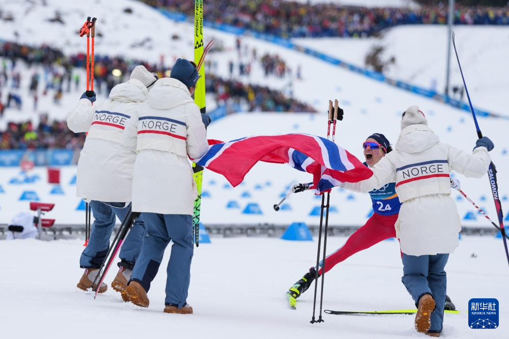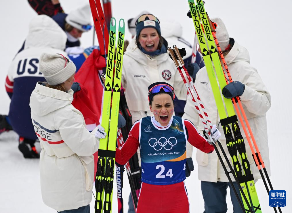 2月14日,挪威队选手海迪·文格(右)在冲线后与队友庆祝。挪威队获得冠军。
