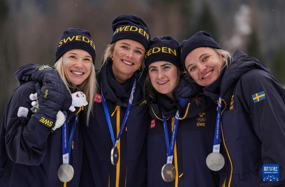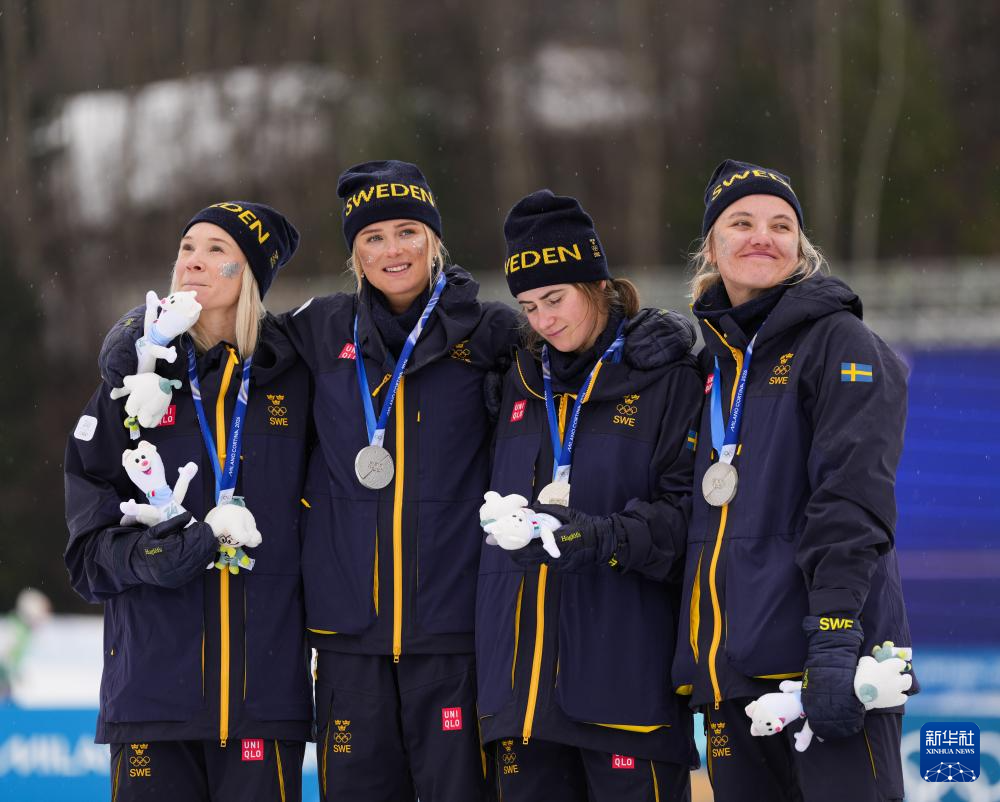 2月14日,获得亚军的瑞典队选手林恩·斯万、埃芭·安德松、弗里达·卡尔松和约娜·松德林(从右至左)在颁奖仪式上合影。