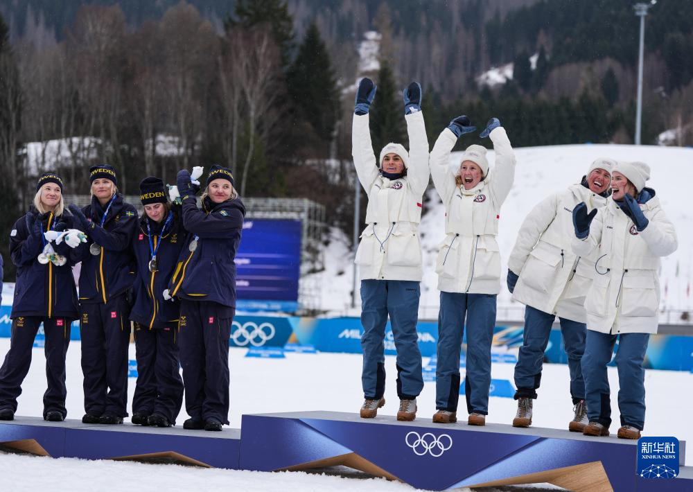 2月14日,冠军挪威队和亚军瑞典队(左)在颁奖仪式上。