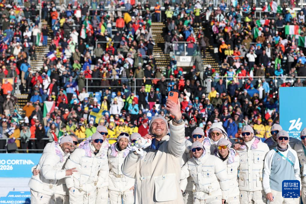 2月15日,季军法国选手雅克兰(前)在颁奖仪式后和队友拍照留念。