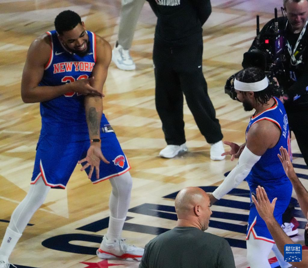 2月14日,尼克斯队球员杰伦·布伦森(右)和队友卡尔·安东尼·唐斯(左)在赢得全明星投篮之星大赛后庆祝。
