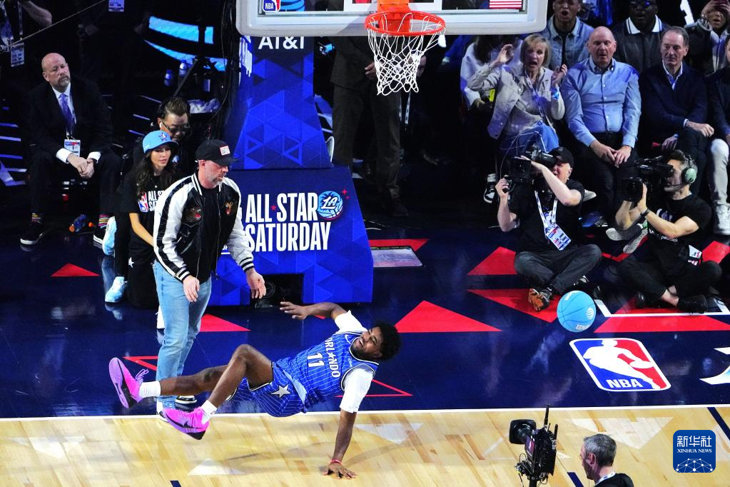 2月14日,魔术队球员杰斯·理查德森在全明星扣篮大赛中扣篮后摔倒在地。