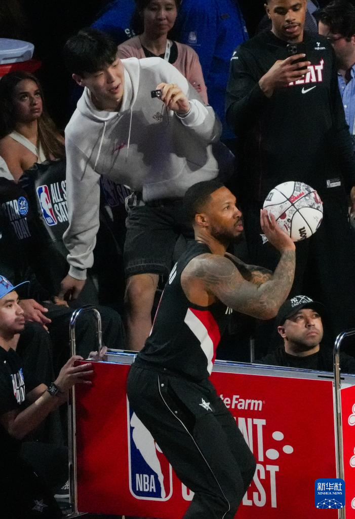 2月14日,开拓者队球员杨瀚森(上)在在全明星三分球大赛中拍摄队友达米安·利拉德(前)。