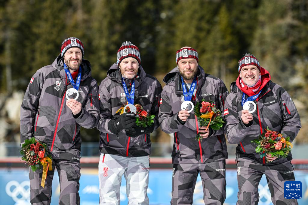 2月15日,2014年索契冬奥会冬季两项男子4×7.5公里接力比赛亚军奥地利队在奖牌重新颁发仪式上。