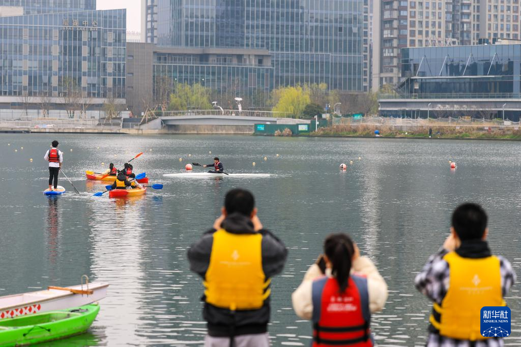 早春时节,一堂水上运动公开课在浙江省宁波市江北区甬江街道星湖公园进行。青年学员们划着皮划艇、桨板,在教练员指导下泛舟湖面,享受水上运动的乐趣。