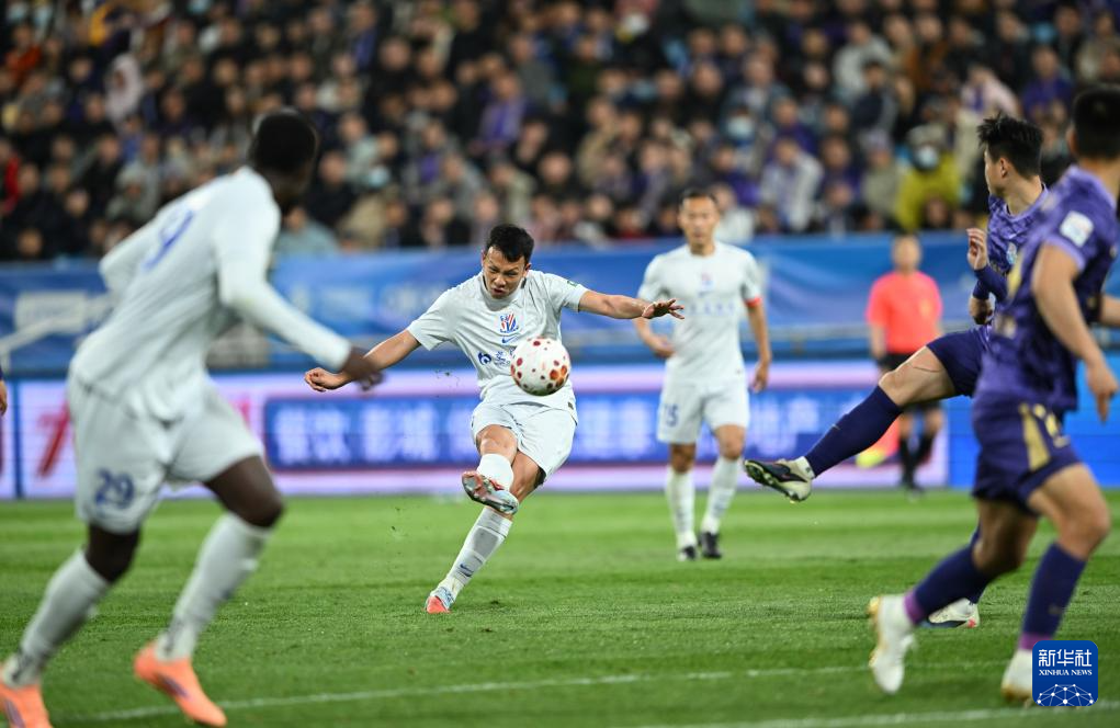 4月5日,上海申花队球员高天意(左二)在比赛中射门。