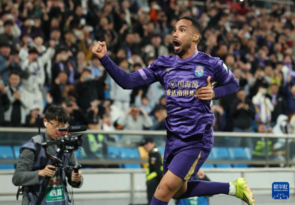 4月5日,天津津门虎队球员谢蒂内在进球后庆祝。