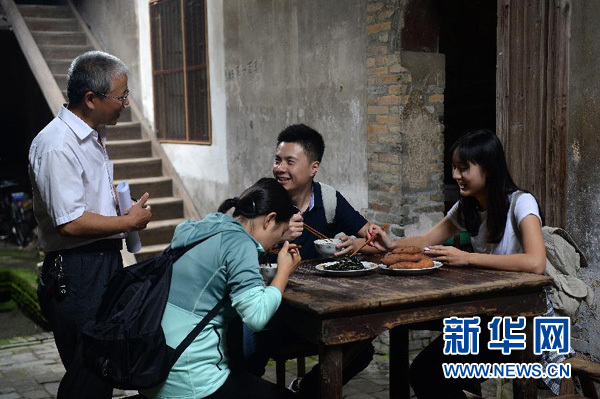 在江西于都縣劉次垣民居內(nèi),三位主播在體驗“吃紅軍飯”(9月16日攝)。 10月13日起,新華社為紀(jì)念紅軍長征勝利80周年推出的系列網(wǎng)絡(luò)直播《紅色追尋——三個年輕人的長征路》精編版視頻將在全國各主要新媒體發(fā)布端和民航、鐵路、公交、戶外大屏等發(fā)布平臺上線。新華社記者 萬象 攝