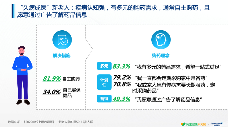 《白皮书》显示,线上购药人群中,女性占到六成,中青年消费者居多,而95后和新老人(50岁以上)以近七成增长率领跑其他人群,成为线上购药“新生力量”。其中,作为互联网时代的原住民,95后健康问题以皮肤、睡眠、用眼等轻症为主,他们很多情况下会选择线上问诊和线上购药,95%的95后在线上购药前爱读其他用户的评论;而新老人也在拥抱数字健康生活,83%的新老人“有多元的药品需求,希望一站式满足”。