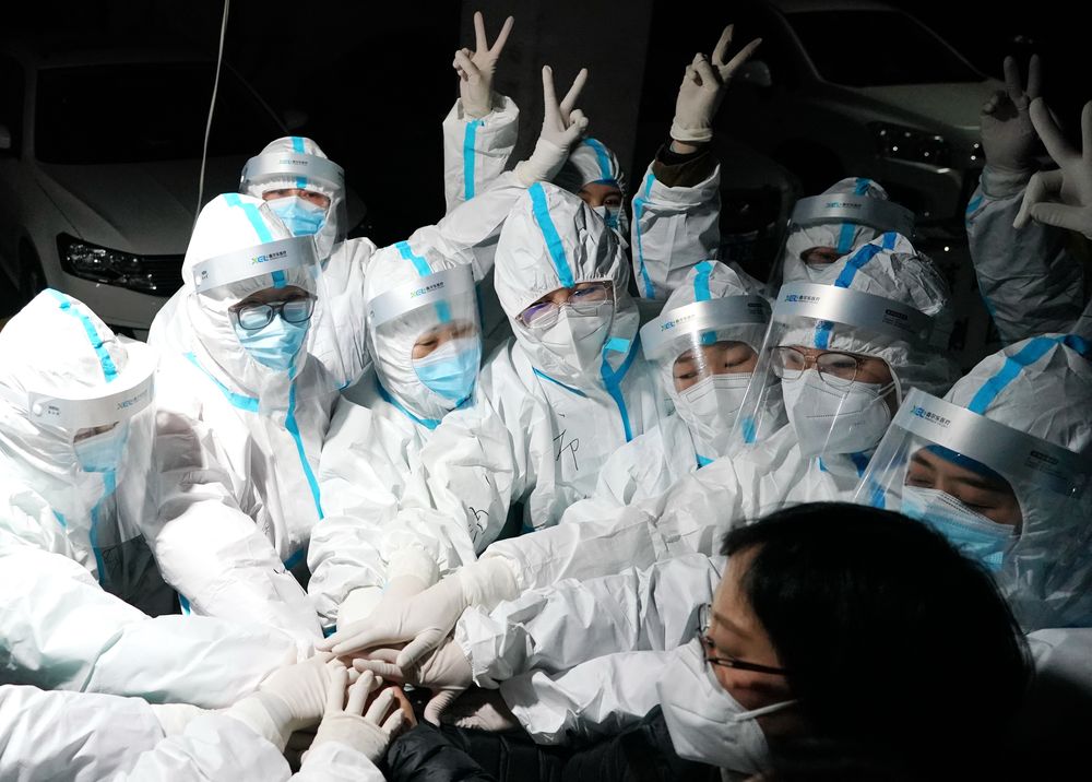 ↑1月7日,在石家莊市裕華區(qū)九里庭院社區(qū),醫(yī)務人員開展核酸檢測前相互加油鼓氣。