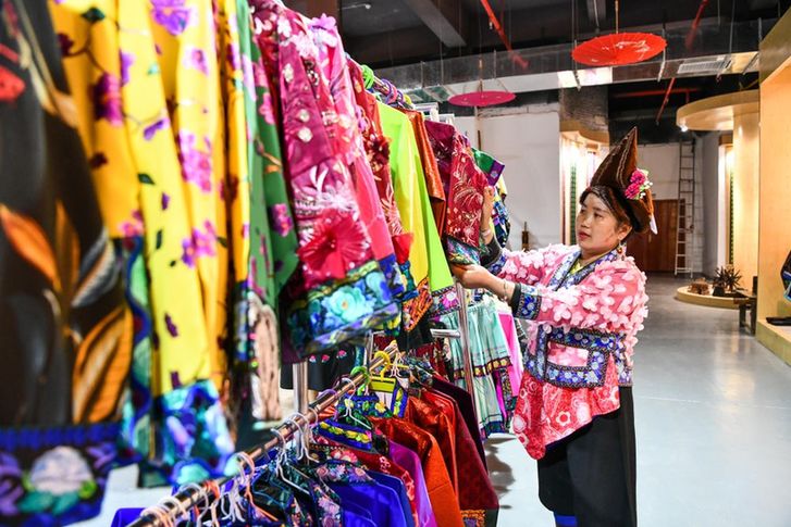 看到我們的生意越做越火,村里更多的姐妹也想加入進(jìn)來(lái),于是,我在2014年成立了民族刺繡專業(yè)合作社,組織大家一起生產(chǎn)。人多了、機(jī)器多了、創(chuàng)意也多了。我們把苗繡元素與現(xiàn)代服飾相結(jié)合,把不同大小、圖案的繡片點(diǎn)綴縫制在背包、衣服、鞋子上,讓消費(fèi)者無(wú)論逛街還是上班都能穿,很受市場(chǎng)歡迎。