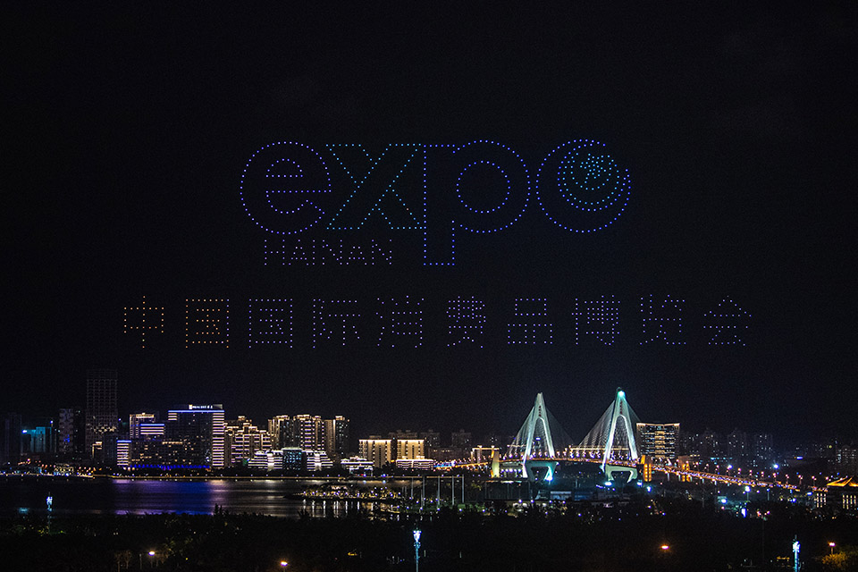 ??? 首屆中國國際消費品博覽會于5月7日至10日在位于海口的海南國際會展中心舉辦。5月6日晚,??谑猩涎轃o人機表演秀,迎接首屆消博會的舉辦。新華社記者 蒲曉旭 攝