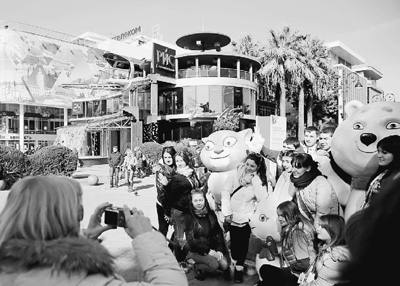 冬奧會期間,大批游客前往索契參觀游玩。圖為游客同冬奧會吉祥物合影留念。