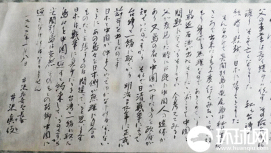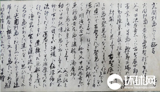 ????伊澤彌喜太長(zhǎng)女伊澤真伎1901年2月生于黃尾嶼。她于1972年1月8日口述并請(qǐng)人代筆,用毛筆寫(xiě)下一份《關(guān)于尖閣列島的證言》,其中披露了其父伊澤彌喜太1891年首次登島開(kāi)發(fā)一事,并明確指出釣魚(yú)島“應(yīng)該歸還給它的故鄉(xiāng)——中國(guó)”。筆者現(xiàn)將部分證言的譯文公諸于眾:“我出生于尖閣列島(譯者注:釣魚(yú)島列島)的黃尾島古賀村。父親是井澤彌喜太(注:經(jīng)核實(shí)應(yīng)為伊澤彌喜太,屬于同音字記錄筆誤)。他曾任古賀辰四郎的業(yè)務(wù)主任,在該島經(jīng)營(yíng)干制鰹魚(yú)工廠(chǎng),也采集信天翁的羽毛以及貝殼等?,F(xiàn)在報(bào)紙等報(bào)道稱(chēng)古賀辰四郎是第一個(gè)發(fā)現(xiàn)該島嶼的人,這是彌天大謊,是絕對(duì)不可能的事情。因?yàn)橛忻魑挠涗浛梢宰C明,我父親于明治二十四年(1891年)航行至魚(yú)釣島(即釣魚(yú)島)、黃尾島,打撈海產(chǎn)品和采集信天翁的羽毛?!赣H登島后曾對(duì)其進(jìn)行調(diào)查,期間在一個(gè)洞穴里發(fā)現(xiàn)兩具身著中國(guó)服裝的骸骨?,F(xiàn)在看來(lái),在父親登島之前可能已有中國(guó)人達(dá)到此處。父親和古賀相識(shí)是因?yàn)楣刨R當(dāng)時(shí)很有錢(qián),他曾主動(dòng)向父親提出:‘你在沖繩經(jīng)營(yíng)事業(yè)需要資金,我們一起合作怎么樣?!?yàn)槭枪刨R出資,所以名義上是古賀經(jīng)營(yíng),但一切事務(wù)實(shí)際上都是由我父親全權(quán)負(fù)責(zé)的。古賀也曾說(shuō)過(guò),他允許我父親在那里自主隨意地經(jīng)營(yíng)。