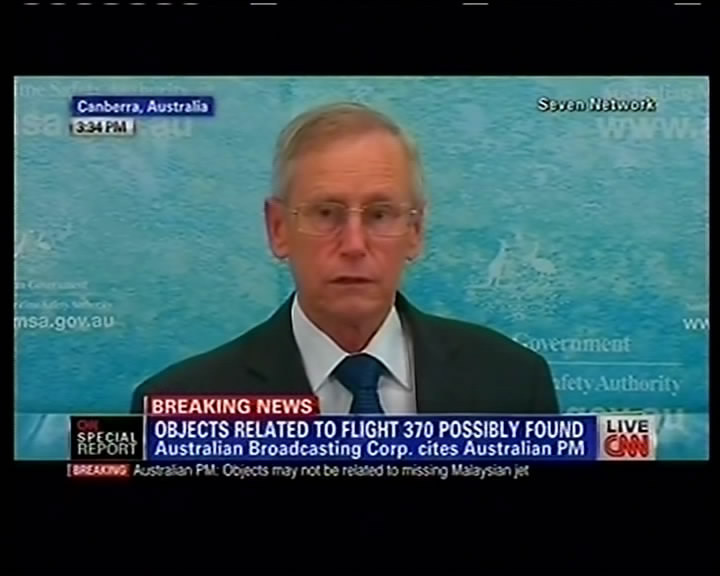 ??? 澳方稱在印度洋中發(fā)現(xiàn)了可能與馬航失聯(lián)客機有關(guān)物體這張3月20日拍攝的CNN視頻截圖顯示,澳大利亞海事安全局官員在堪培拉召開的新聞發(fā)布會上發(fā)言(左圖為相關(guān)搜尋海域的示意圖)。澳大利亞總理阿博特當日在議會說,澳方在印度洋中發(fā)現(xiàn)了可能與馬航失聯(lián)客機有關(guān)的兩個物體。澳大利亞海事安全局官員當日說,發(fā)現(xiàn)可疑碎片的位置與之前確定的馬航失聯(lián)客機南部搜尋航道高度吻合,但當?shù)睾S蛩沫h(huán)境非常差。新華社發(fā)