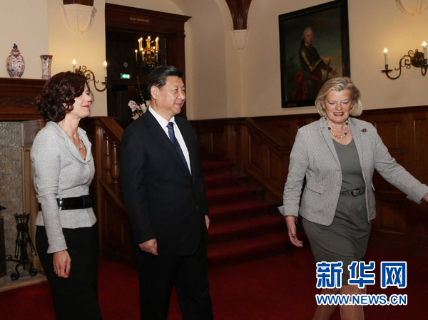 ????3月24日,國(guó)家主席習(xí)近平在海牙會(huì)見(jiàn)荷蘭議會(huì)一院議長(zhǎng)布勒克-克諾爾(右)和二院議長(zhǎng)范米爾滕伯格。 新華社記者 劉衛(wèi)兵 攝