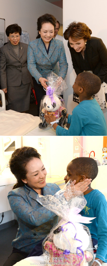 ???? 彭麗媛走進哮喘病患兒毛蘇的病房,向他贈送了可愛的熊貓玩具。臨別,毛蘇想擁抱一下她,彭麗媛立刻蹲下身,撫摸著毛蘇可愛的小臉蛋,把他擁在懷里,毛蘇高興地親吻了彭麗媛的臉頰。