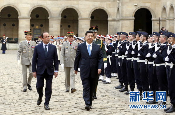 ??? 據(jù)新華社“新國際”微博3月27日?qǐng)?bào)道,法國總統(tǒng)奧朗德26日下午在巴黎榮軍院廣場舉行盛大儀式,歡迎中國國家主席習(xí)近平。打破常規(guī)在榮軍院舉行歡迎儀式,奧朗德總統(tǒng)一路陪同,146名騎兵左右護(hù)衛(wèi) ......隆重的禮儀,盡顯東道主的熱情和尊重。