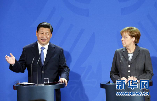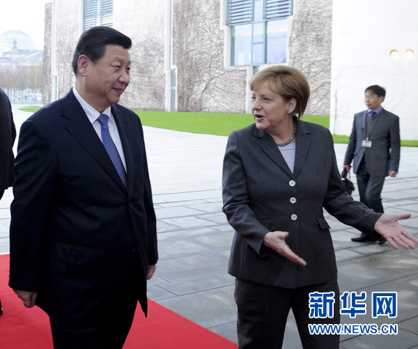 ????兩國領(lǐng)導(dǎo)人還共同會見了記者。習(xí)近平指出,中德關(guān)系發(fā)展到今天,兩國務(wù)實(shí)合作的效應(yīng)不再是簡單的一加一等于二,而是遠(yuǎn)遠(yuǎn)大于二。深化中德合作,利在兩國,惠及歐洲和世界。我這次訪問期間,雙方?jīng)Q定將兩國關(guān)系提升為全方位戰(zhàn)略伙伴關(guān)系,并簽署了多項合作協(xié)議。中德關(guān)系站在新起點(diǎn)上,面臨新的發(fā)展機(jī)遇。相信到2020年,歐洲的德國和亞洲的中國,經(jīng)濟(jì)實(shí)力將更強(qiáng)大,互利合作將更緊密,在國際事務(wù)中的影響將進(jìn)一步提高。