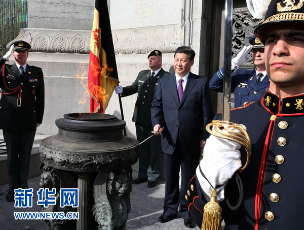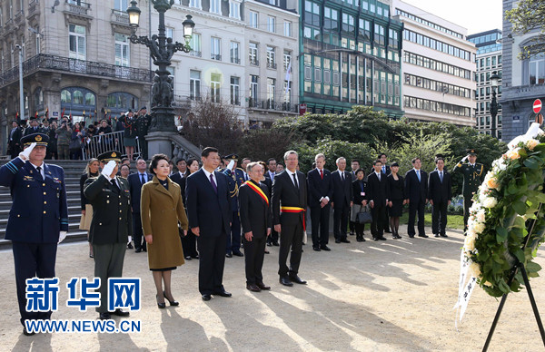 3月30日,國家主席習(xí)近平在布魯塞爾向比利時無名戰(zhàn)士墓獻花圈。 新華社記者 龐興雷 攝
