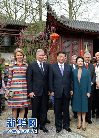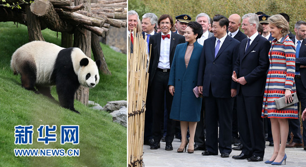 ????習(xí)近平和夫人彭麗媛抵達(dá)時(shí),受到菲利普國(guó)王和瑪?shù)贍柕峦鹾?、比利時(shí)首相迪呂波熱情迎接。兩國(guó)領(lǐng)導(dǎo)人一同步入中國(guó)園。亭臺(tái)樓閣、雕梁畫棟、鳥語(yǔ)花香,這里宛如一幅恬靜祥和的中華寫意畫。兩國(guó)元首夫婦沿著回廊曲徑,穿過青翠竹林,前往大熊貓園。他們邊走邊談,回顧中比兩國(guó)友好交往。