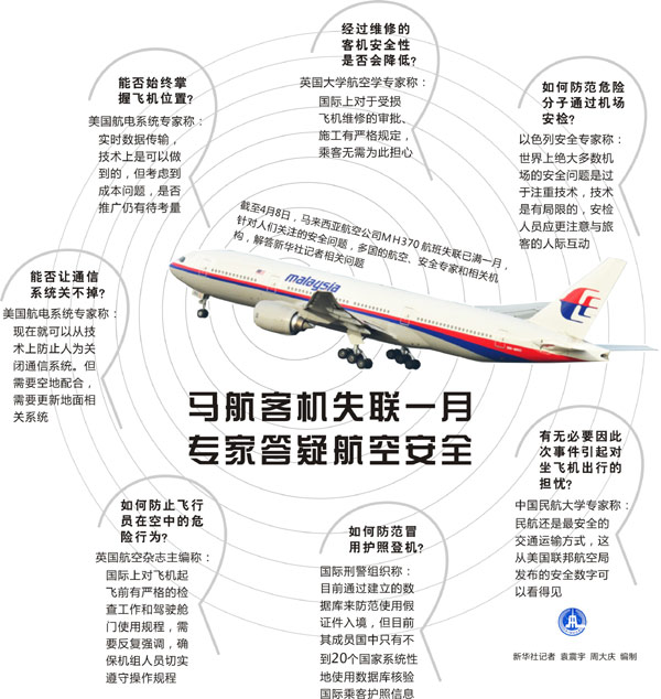 圖表:馬航客機失聯(lián)一月,專家答疑航空安全。 新華社記者 袁振宇 周大慶 編制