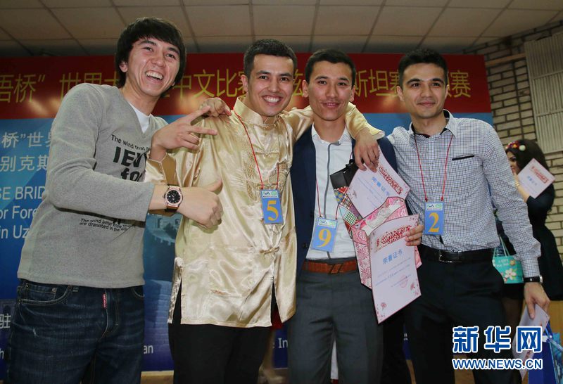 4月25日,烏茲別克斯坦塔什干國立東方學(xué)院大禮堂比賽現(xiàn)場,獲獎(jiǎng)選手在合影留念。