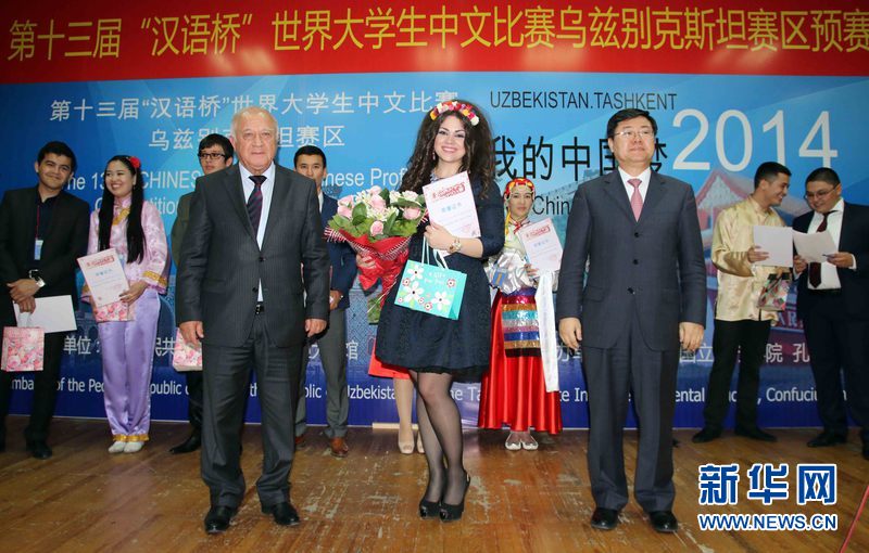 ????4月25日,烏茲別克斯坦塔什干國立東方學院大禮堂,中國駐烏茲別克斯坦大使孫立杰在為獲得特等獎的塔什干東方學院學生詩琳頒獎。