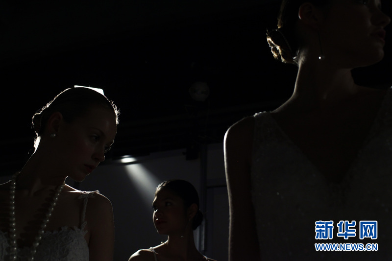 場外正在準備登臺展示婚紗的模特。