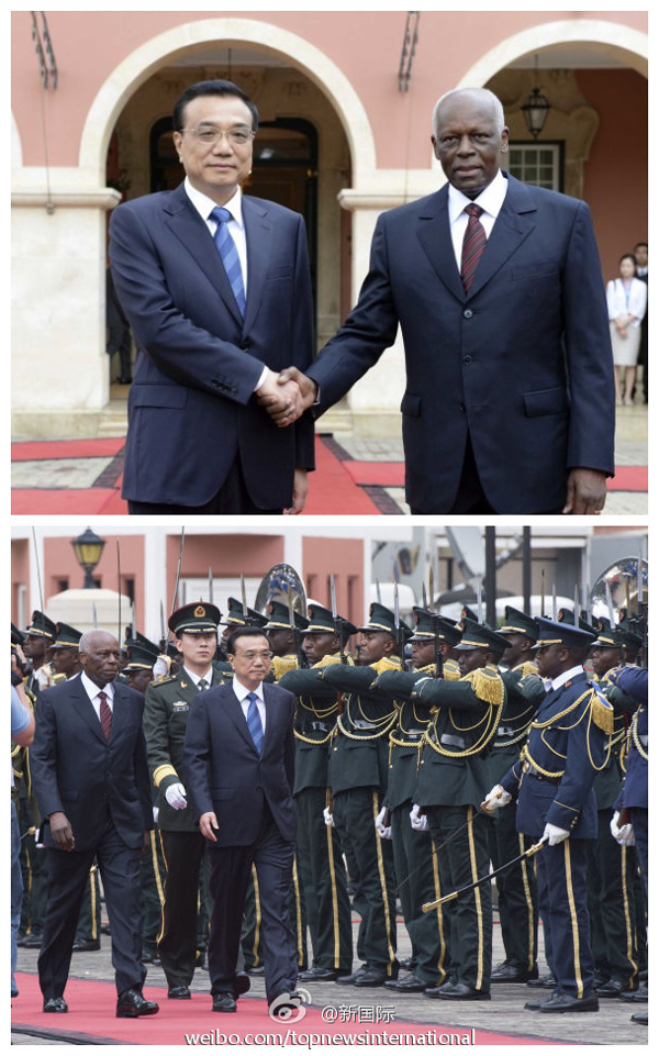 ????新華網(wǎng)北京5月9日電? 據(jù)新華社“新國際”微博報道,5月9日,國務(wù)院總理李克強(qiáng)在羅安達(dá)總統(tǒng)府出席安哥拉總統(tǒng)多斯桑托斯舉行的歡迎儀式。李克強(qiáng)總理在多斯桑托斯總統(tǒng)陪同下檢閱了儀仗隊。