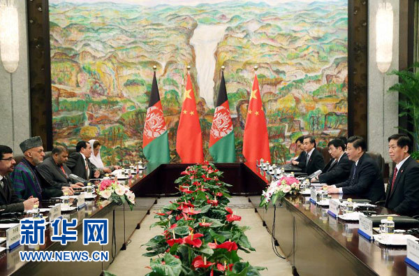 ????卡爾扎伊表示,阿中兩國有著兄弟般深厚的友誼,中國是阿富汗信賴的好鄰居。阿方感謝中方給予阿富汗和平重建的寶貴支持。無論阿富汗大選結果如何,阿方?jīng)Q心同中方發(fā)展親密的睦鄰友好關系,希望中方繼續(xù)幫助阿富汗實現(xiàn)穩(wěn)定、和解、發(fā)展,幫助阿富汗培訓各類人才??植乐髁x、跨國犯罪是阿中兩國共同的敵人,阿方愿同中方合力打擊。
