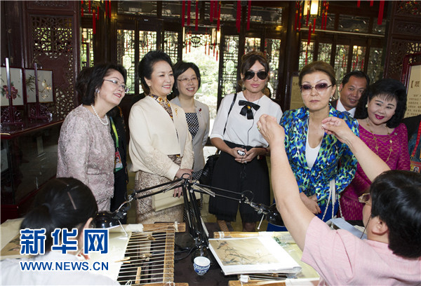 ????在還云樓,彭麗媛和來賓們欣賞少兒歌舞、京劇、昆曲、滬劇、太極拳、書法、剪紙藝術。濃濃的中國元素、精彩的文藝演出,贏得來賓們陣陣掌聲。