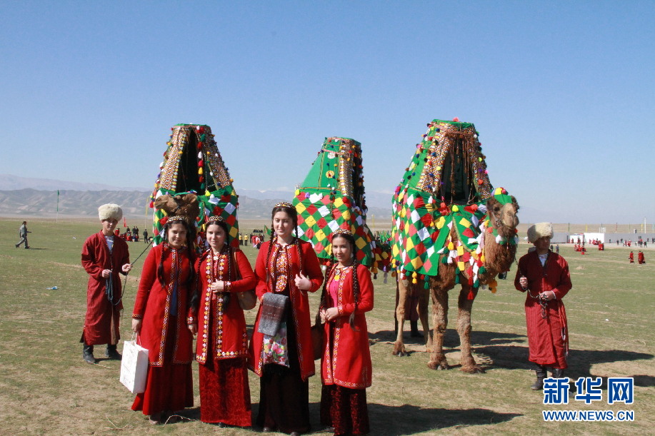 ????記者還看到過20來頭駱駝組成的駝群,其中頭駱身上綁著個布袋。駱駝低頭吃草,頭駝警覺地給它們站崗放哨。不一會兒,一些駱駝走到頭駝身前,向它施貼臉禮,頭駝一一回禮。當(dāng)記者試圖靠近時,頭駝發(fā)出低沉的怪聲,群駝迅速抬起頭來,慢慢地朝遠方走去。在過節(jié)時,牧民小伙穿上紅色條狀長袍,頭戴白色羊羔皮帽,手牽的駱駝身上裹著人工織的毛毯,背上架著花轎,花轎中坐著美麗少女,少女頭戴小帽,梳著兩根長辮,身穿蓋過腳面的長裙。這是在給節(jié)日助興。同時,這也是土庫曼斯坦民族婚禮中迎娶新娘的一個縮影。在現(xiàn)實生活中,城市人很少見到駱駝。于是在各種活動中,跟打扮得如此漂亮的駱駝合影也是一件趣事。