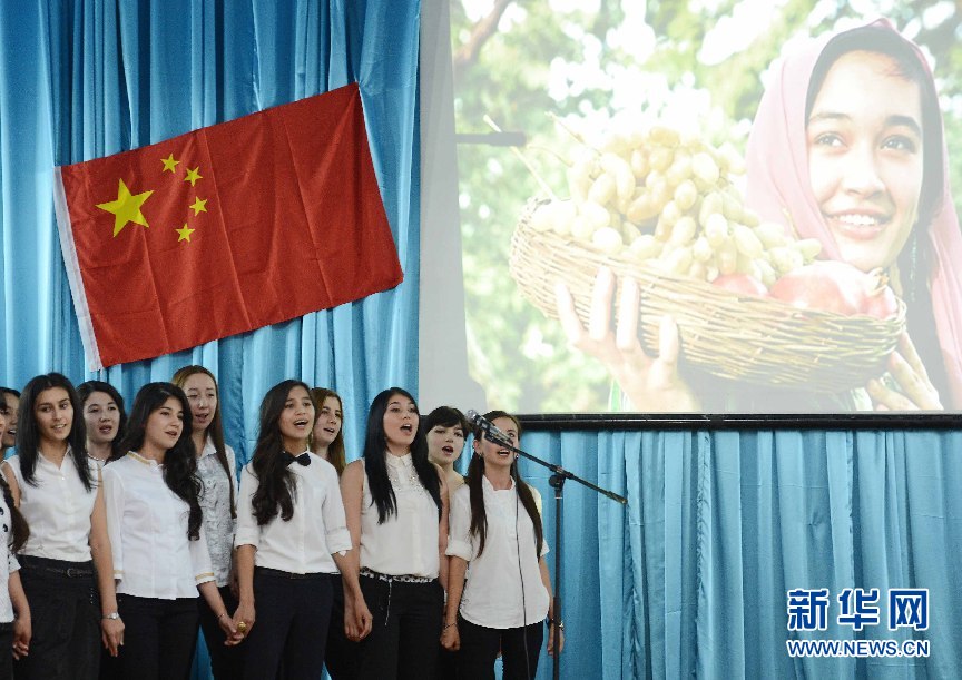 6月9日,學(xué)生代表在烏茲別克斯坦首都塔什干的烏世界語(yǔ)言大學(xué)禮堂表演節(jié)目。