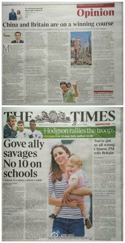 ????新華網(wǎng)北京6月17日電 據(jù)新華社“新國際”微博報道,訪英前夕,李克強(qiáng)總理16日在英國主流媒體《泰晤士報》發(fā)表題為“中英正走在共贏的道路上”的署名文章。對此,該報同日在頭版配發(fā)文章稱,李克強(qiáng)的文章標(biāo)志著一場“展示真正中國的運動”已開始,中國作為世界重要國家,將為維護(hù)和平與合作作出積極貢獻(xiàn)。?
