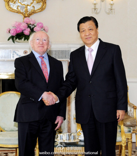 ??? 新華網(wǎng)北京6月18日電 據(jù)新華社“新國際”微博報道,中共中央政治局常委、中央書記處書記劉云山17日結(jié)束愛爾蘭之行。他在會見愛總統(tǒng)希金斯時說,中國與愛爾蘭雖相距遙遠,但在雙邊和國際事務(wù)中存在廣泛的共同利益,兩國關(guān)系成為不同幅員、制度、發(fā)展階段國家平等相待、友好合作的典范。