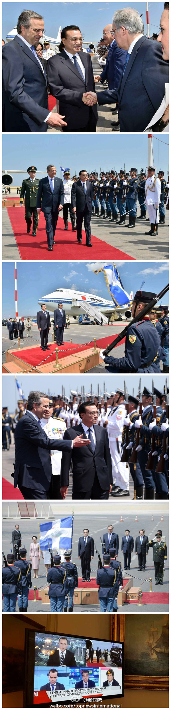 新華網(wǎng)北京6月20日電 據(jù)新華社“新國(guó)際”微博報(bào)道,李克強(qiáng)總理偕夫人程虹19日下午乘專(zhuān)機(jī)抵達(dá)雅典,開(kāi)始對(duì)希臘的正式訪(fǎng)問(wèn),希臘總理薩馬拉斯和夫人到機(jī)場(chǎng)迎接。現(xiàn)場(chǎng)奏響中希兩國(guó)國(guó)歌,李克強(qiáng)在薩馬拉斯陪同下檢閱了儀仗隊(duì)。希臘是西方文明發(fā)源地,這是李克強(qiáng)總理首次訪(fǎng)希,將推進(jìn)雙方海洋、文化等領(lǐng)域合作。