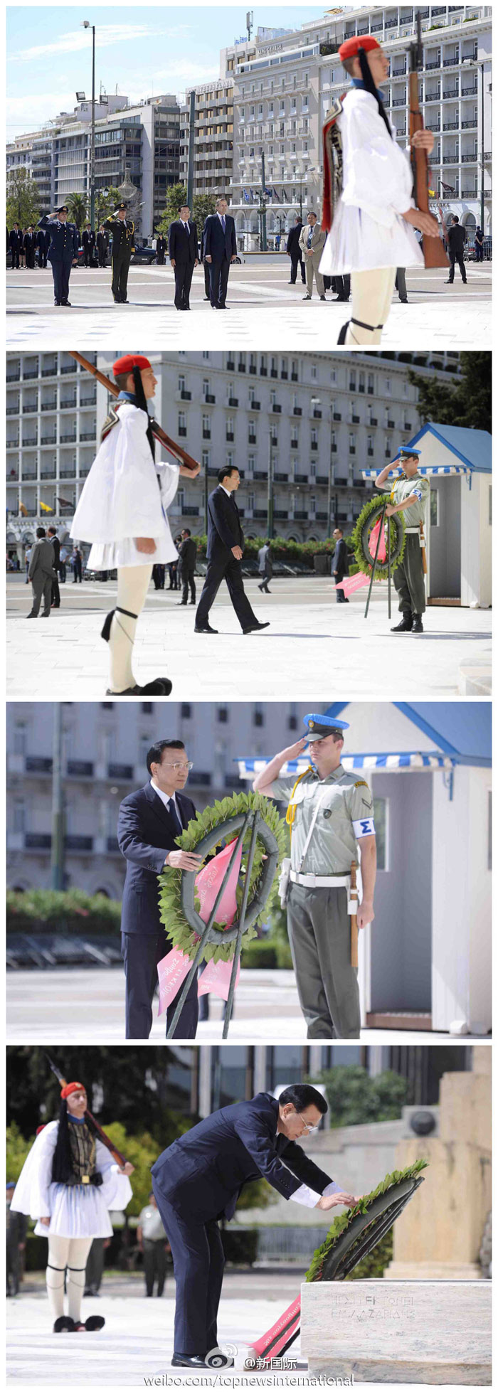 ??? 新華網(wǎng)北京6月20日電 據(jù)新華社“新國際”微博報(bào)道,正在希臘訪問的李克強(qiáng)總理19日向希臘無名戰(zhàn)士紀(jì)念碑獻(xiàn)花圈。該紀(jì)念碑1932年建成,碑上鐫刻公元前5世紀(jì)希臘政治家伯里克利斯一篇悼詞中的兩句名言:“全世界杰出戰(zhàn)士之墓”、“安放無名氏的床第”,及希臘從上世紀(jì)初到五十年代與外國交戰(zhàn)的戰(zhàn)役名稱和地名。