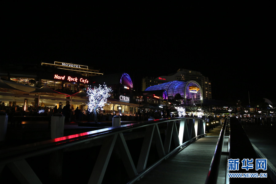 ????6月13日起,為期1個(gè)月的大型冬季冰雪活動(dòng)在悉尼市中心的情人港(Darling Harbour)為悉尼市民冬季的生活增添了些許名副其實(shí)的冬季氣氛。圖為情人港岸邊沿路的樹燈。。新華社記者 李冰 攝