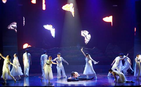 ????此次演出特邀中方以詩經(jīng)經(jīng)典《關(guān)雎》《摽有梅》開場,演員錦衣華服,緩緩起聲,琴音低沉哀鳴高亢交錯,歌聲余音繞梁之際,韓國音樂劇《蝴蝶博士》華麗登場。伴隨著樂隊的現(xiàn)場演奏,音樂劇主角石宙明以大段韓語獨(dú)白震撼全場,兩側(cè)屏幕同步顯示中文翻譯。為照顧現(xiàn)場觀眾,韓方演員遇到簡單詞匯則以普通話來詮釋劇情,引發(fā)現(xiàn)場觀眾共鳴。兩個節(jié)目在動與靜,內(nèi)斂與奔放中,碰撞出藝術(shù)火花。中韓兩國藝術(shù)家跨越語言障礙,用不同的藝術(shù)形式表達(dá)了共同的愿望:思考生活,憧憬未來。