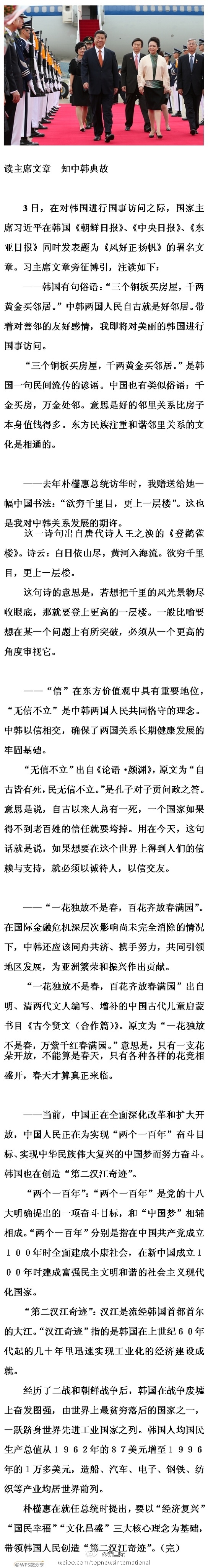 ????新華網(wǎng)北京7月4日電 據(jù)新華社“新國際”微博報道,3日,在對韓國進行國事訪問之際,國家主席習(xí)近平在韓國《朝鮮日報》、《中央日報》、《東亞日報》同時發(fā)表題為《風(fēng)好正揚帆》的署名文章。習(xí)主席文章旁征博引,注讀詳見長微博。