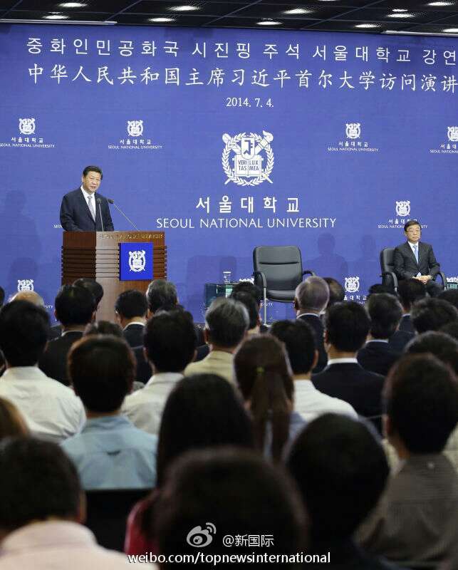 ??? 新華網(wǎng)北京7月4日電 據(jù)新華社“新國際”微博報道,首爾大學(xué)的大講堂座無虛席,傾聽中國,感受中韓夢想的交匯。習(xí)主席說,要有海納百川的胸懷,以開放包容心態(tài)虛心傾聽世界的聲音。中國將繼續(xù)向世界學(xué)習(xí)、向各國人民學(xué)習(xí),學(xué)習(xí)人類創(chuàng)造的一切文明成果,推動中國和世界發(fā)展得更好。?