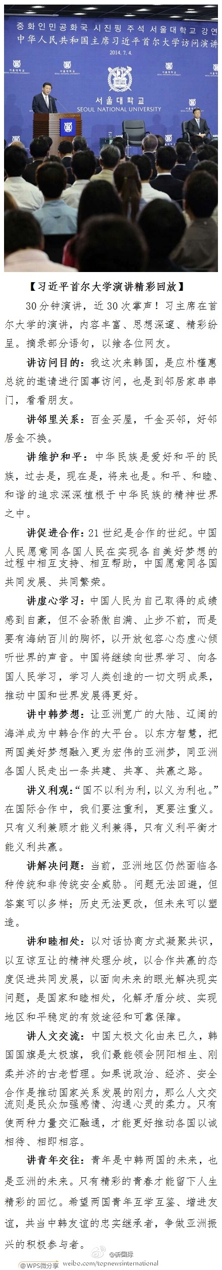 ???? 新華網(wǎng)北京7月4日電 據(jù)新華社“新國(guó)際”微博報(bào)道,30分鐘演講,近30次掌聲!習(xí)主席在首爾大學(xué)的演講,內(nèi)容豐富、思想深邃、精彩紛呈。摘錄部分語(yǔ)句,以饗各位網(wǎng)友。