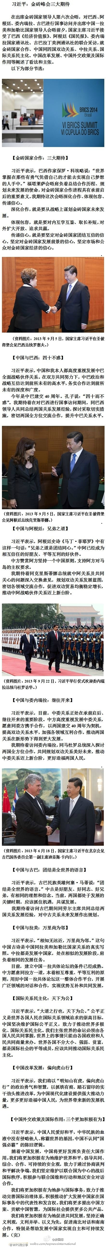 ???? 新華網(wǎng)北京7月15日電 據(jù)新華社“新國際”微博報道,在出席金磚國家領(lǐng)導(dǎo)人第六次會晤,對巴西、阿根廷、委內(nèi)瑞拉、古巴進(jìn)行國事訪問并出席中國-拉美和加勒比國家領(lǐng)導(dǎo)人會晤前夕,國家主席習(xí)近平接受了巴西《經(jīng)濟(jì)價值報》、阿根廷《國民報》、委內(nèi)瑞拉國家通訊社、古巴拉丁美洲通訊社的聯(lián)合采訪。精彩內(nèi)容請點(diǎn)長微博。?